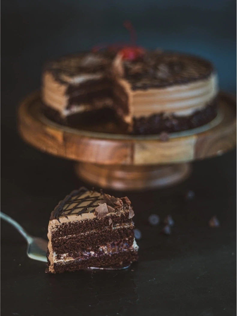 Layers of light & airy chocolate bavaroise-white, milk & dark chocolate on marble sponge garnished with creamy chocolate.