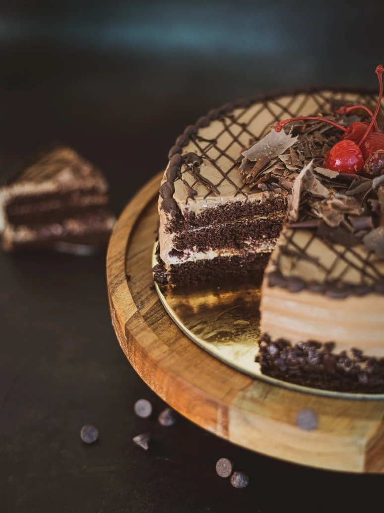 Finest chocolate mousse & pistachio bavaroise with hazelnut biscuit topped with hazelnut macaroon.1 kg and above will only be available after 24 hours.