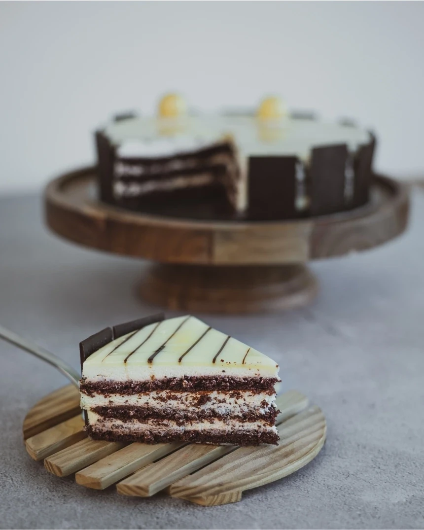 Finest chocolate mousse & pistachio bavaroise with hazelnut biscuit topped with hazelnut macaroon.1 kg and above will only be available after 24 hours.