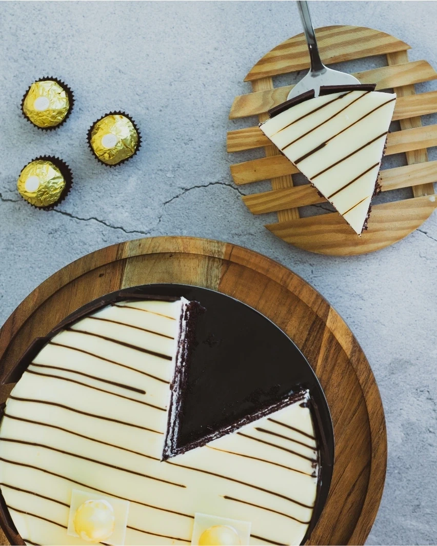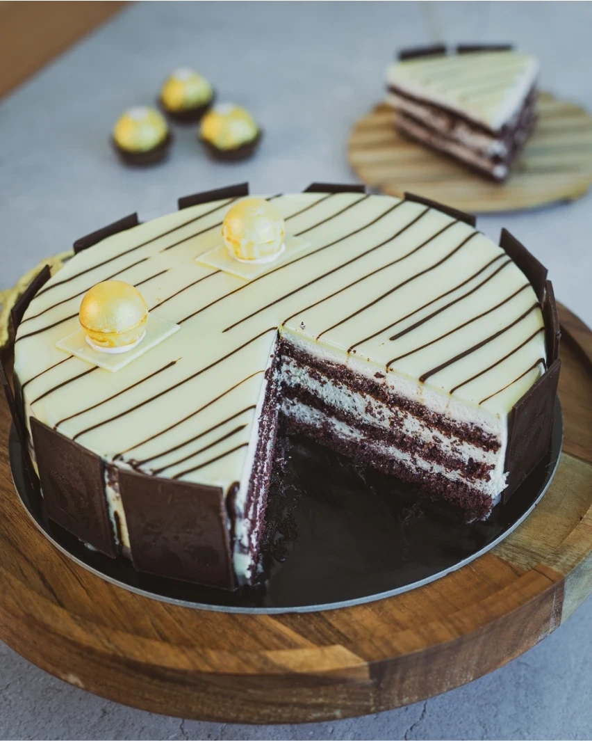 Beautifully moist marble sponge covered in milk chocolate filled with praline, nougatine, feuilletine, fresh cream & nutella.1 kg and above will only be available after 24 hours.